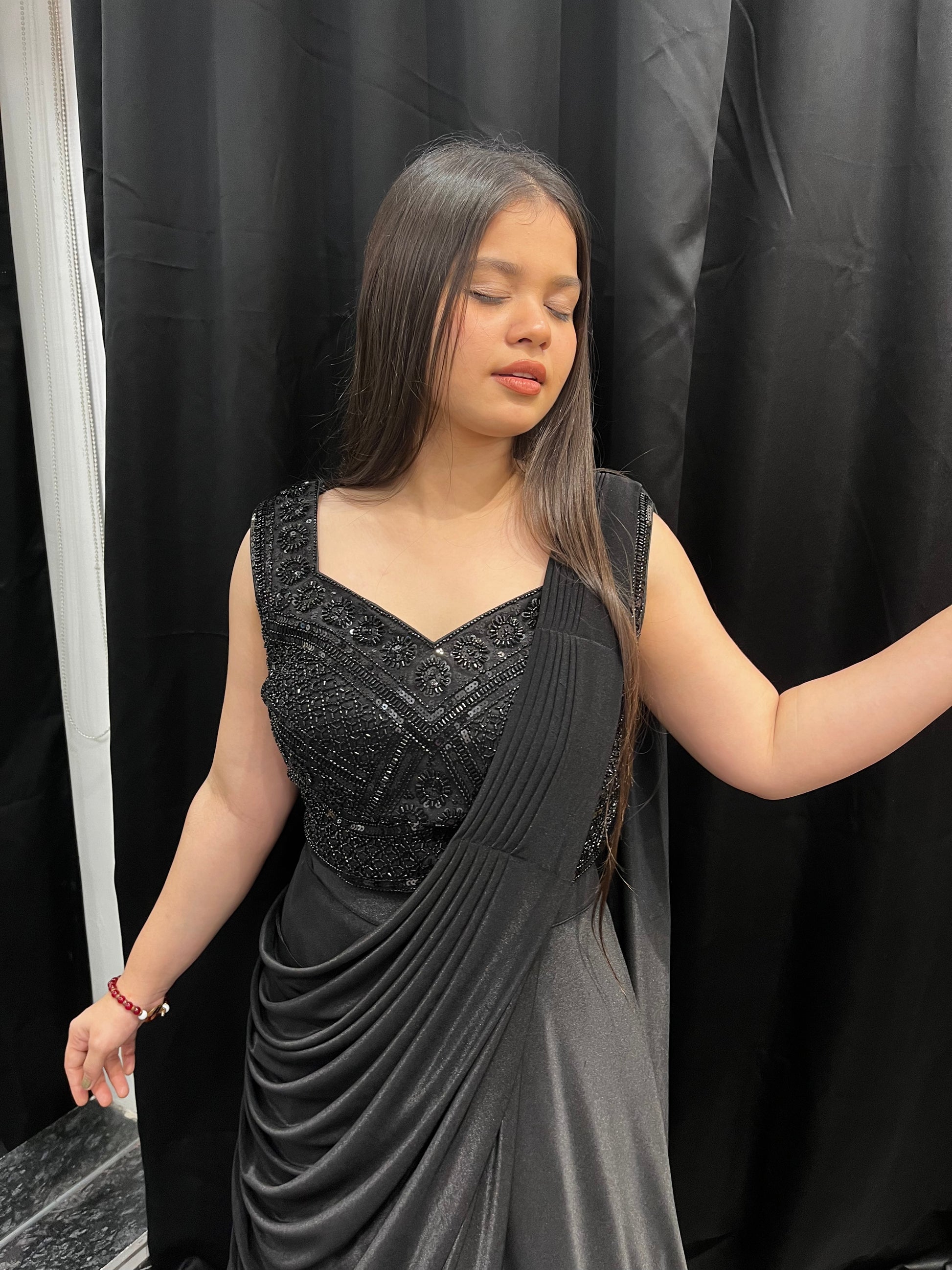 Lycra Fabric Saree-Style Lehenga with Hand-Embroidered Blouse