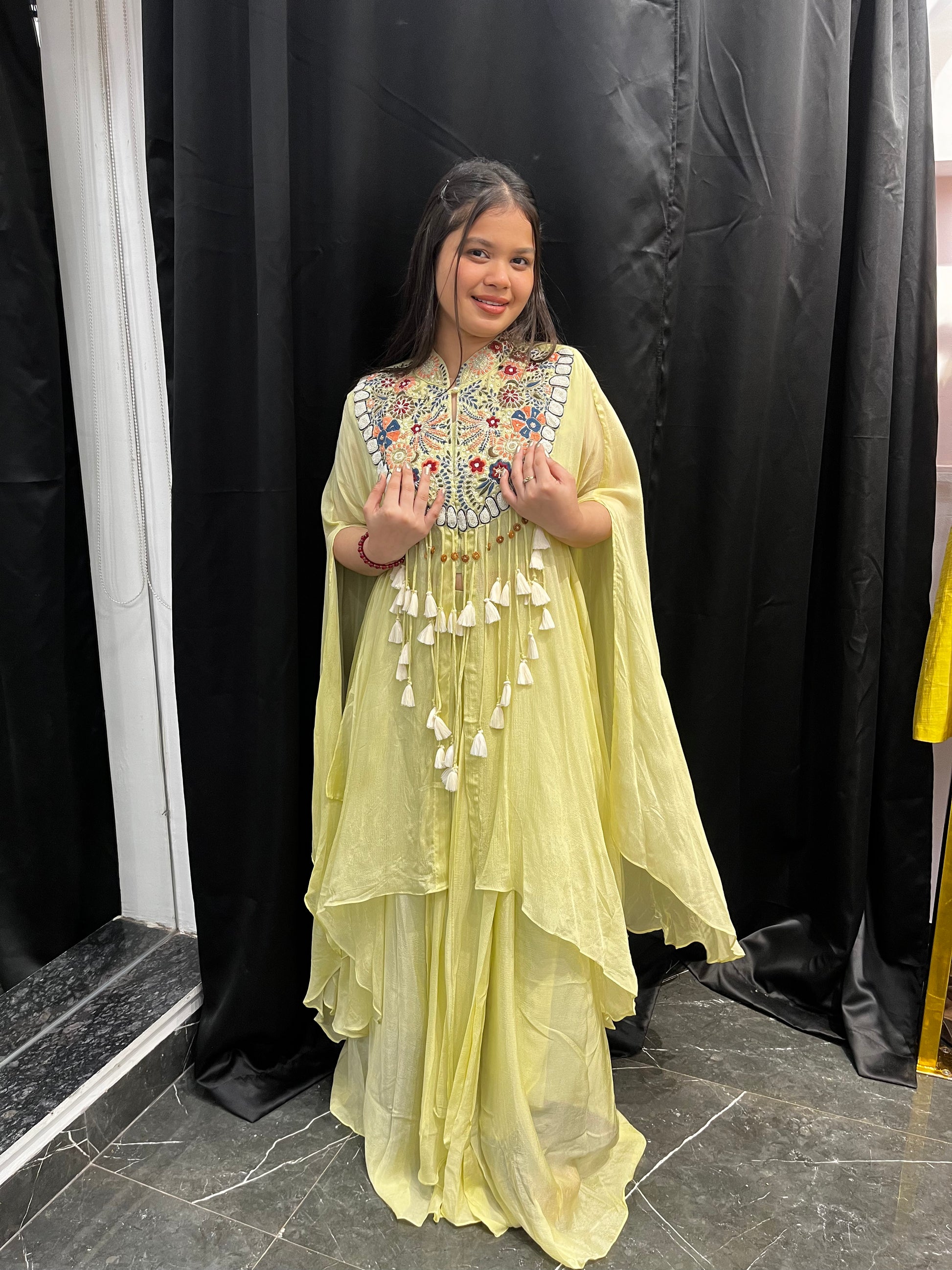 Pure Chinon Fabric 3-Piece Indo Western Set – Hand Embroidered with Tassels