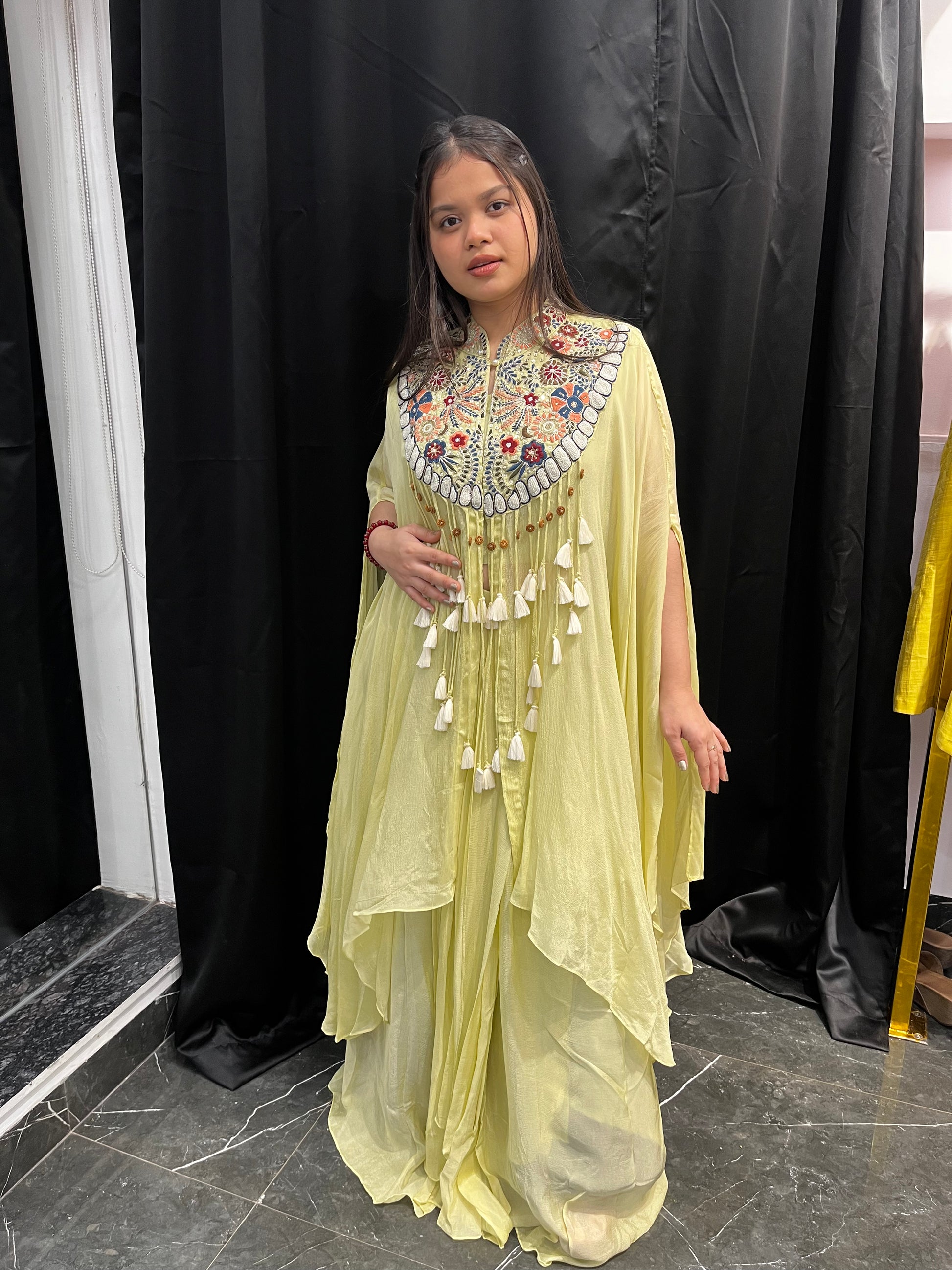 Jacket-Style Cape – adorned with exquisite hand embroidery and playful tassel hangings for a statement finish.